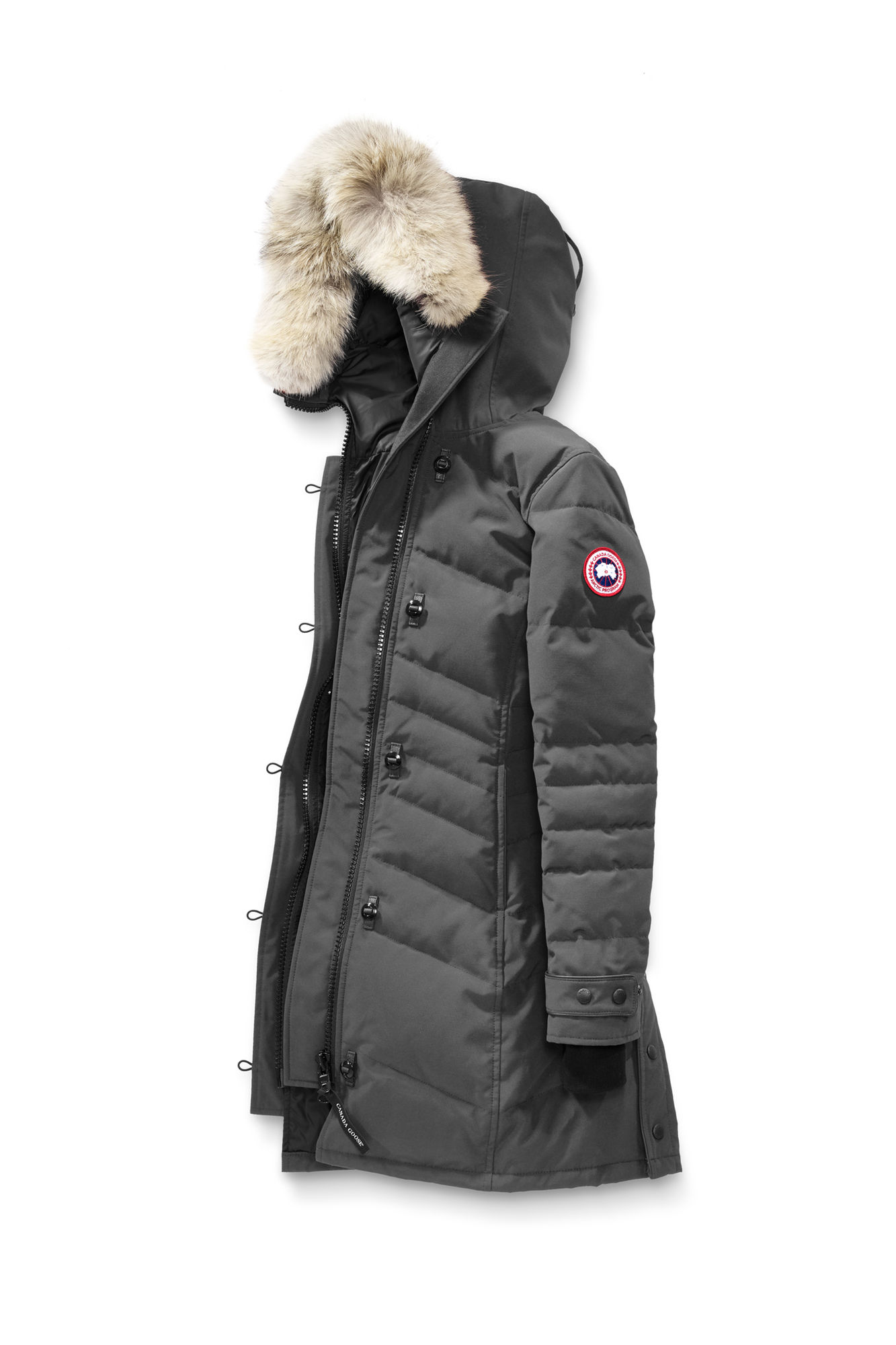 - Non-removable, adjustable hood with a removable fur ruff