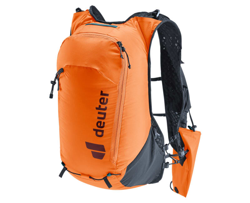 Ultra-lightweight and super comfortable: wide, ergonomic vest-style shoulder straps with elasticated compression system, two adjustable sternum straps and soft material against the back create a garment-like fit. A stretch mesh inner pocket and side compression straps help eliminate load wobble no matter how challenging the terrain. A holster pocket on the front of one shoulder strap makes it quick and easy to access collapsible trekking poles. And there is space for the 2 included soft flasks and a GPS in the shoulder strap pockets. The body fabric is made from 100% recycled materials and is bluesign certified.