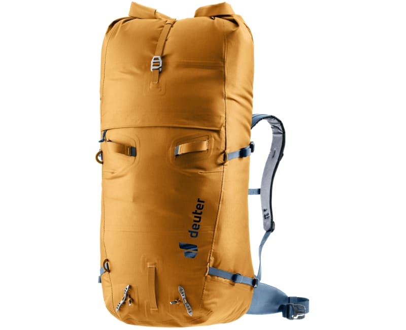 The hard-wearing material, taped and welded seams, and TPU-coated, lapped zippers, combined with a roll-top lid ensure no moisture will penetrate this waterproof mountaineering backpack. Hip fins that stow away at the sides contribute not only to the outstanding comfort-to-weight ratio but also allows alpinists to wear it with a climbing harness. Cleverly positioned attachment loops and compression straps for attaching skis are just some of the features that make this waterproof backpack so versatile.