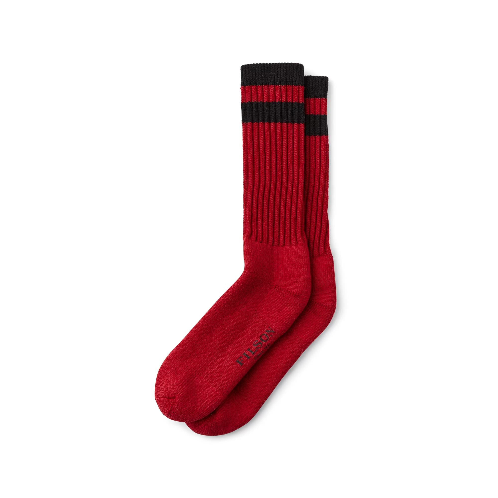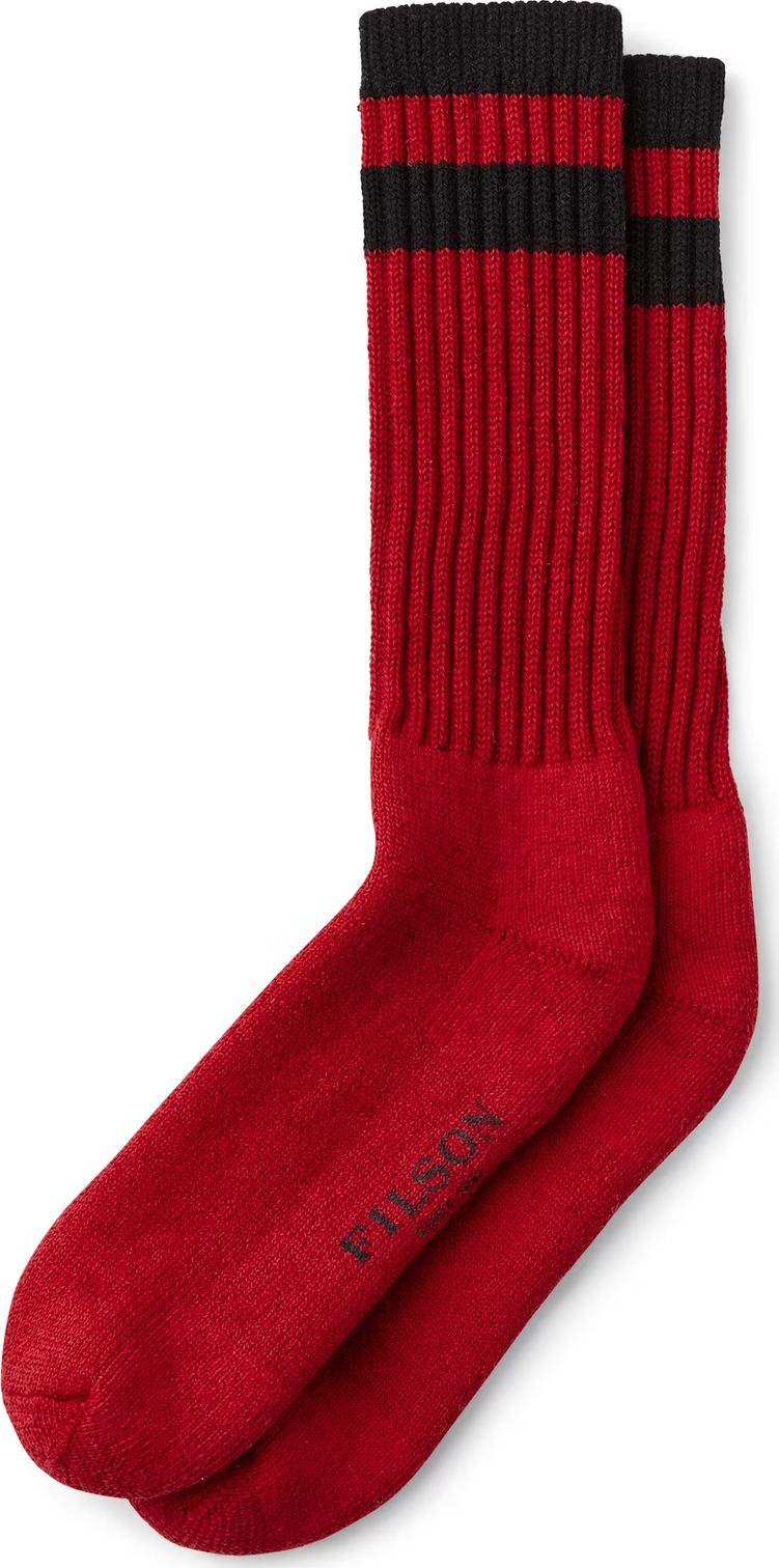 Ideal for frigid weather, under fishing waders, or long hours in the snow, Filson's thick 1970s Logger Thermal Socks feature a high wool content for excellent warmth and moisture management. Thermal knit construction improves insulation and adds cushioning. Stretch ribbing keeps socks up and helps fight muscle fatigue. Flat toe seams minimize rubbing.
