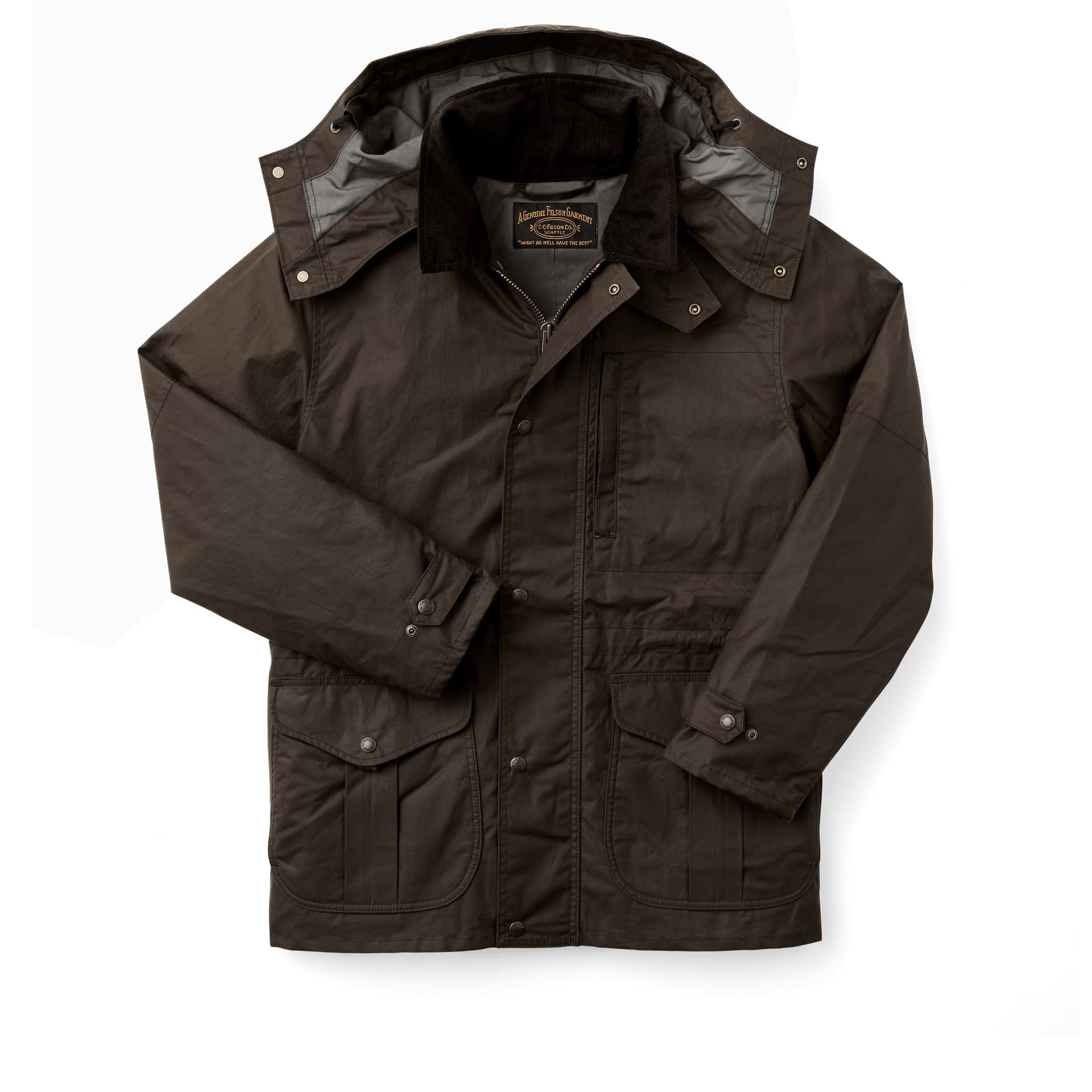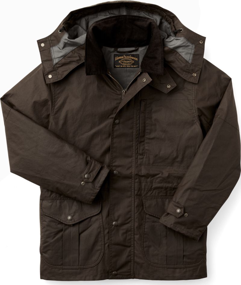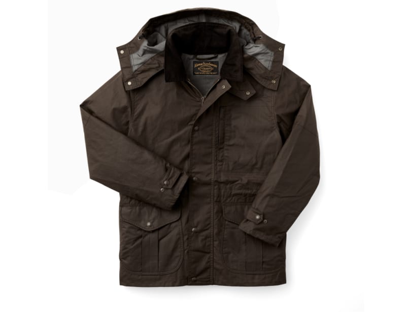 The Cover Cloth Woodland Jacket is an update to our classic, decades-proven Mile Maker Coat. The 8-oz. oil finish Cover Cloth shell blocks wind and water. Its fully lined with dry finish Cover Cloth in the torso and easy-layering polyester twill in the sleeves. The front secures with a two-way metal zipper for versatile ventilating options, and the hem and cuffs are adjustable for a custom fit. The high-capacity cargo pockets hide flannel-lined handwarmer pockets. Double-layer forearm reinforcements add durability. Its compatible with Filson zip-in liners and includes a detachable hood.