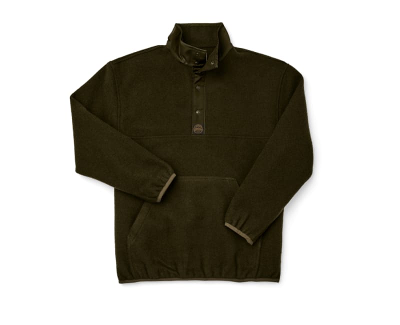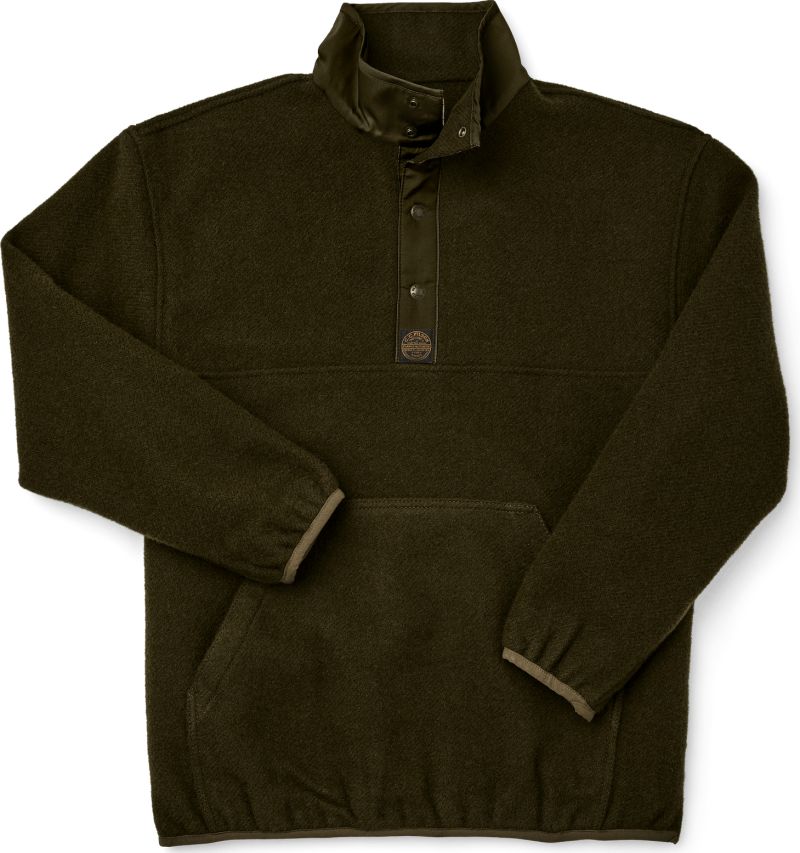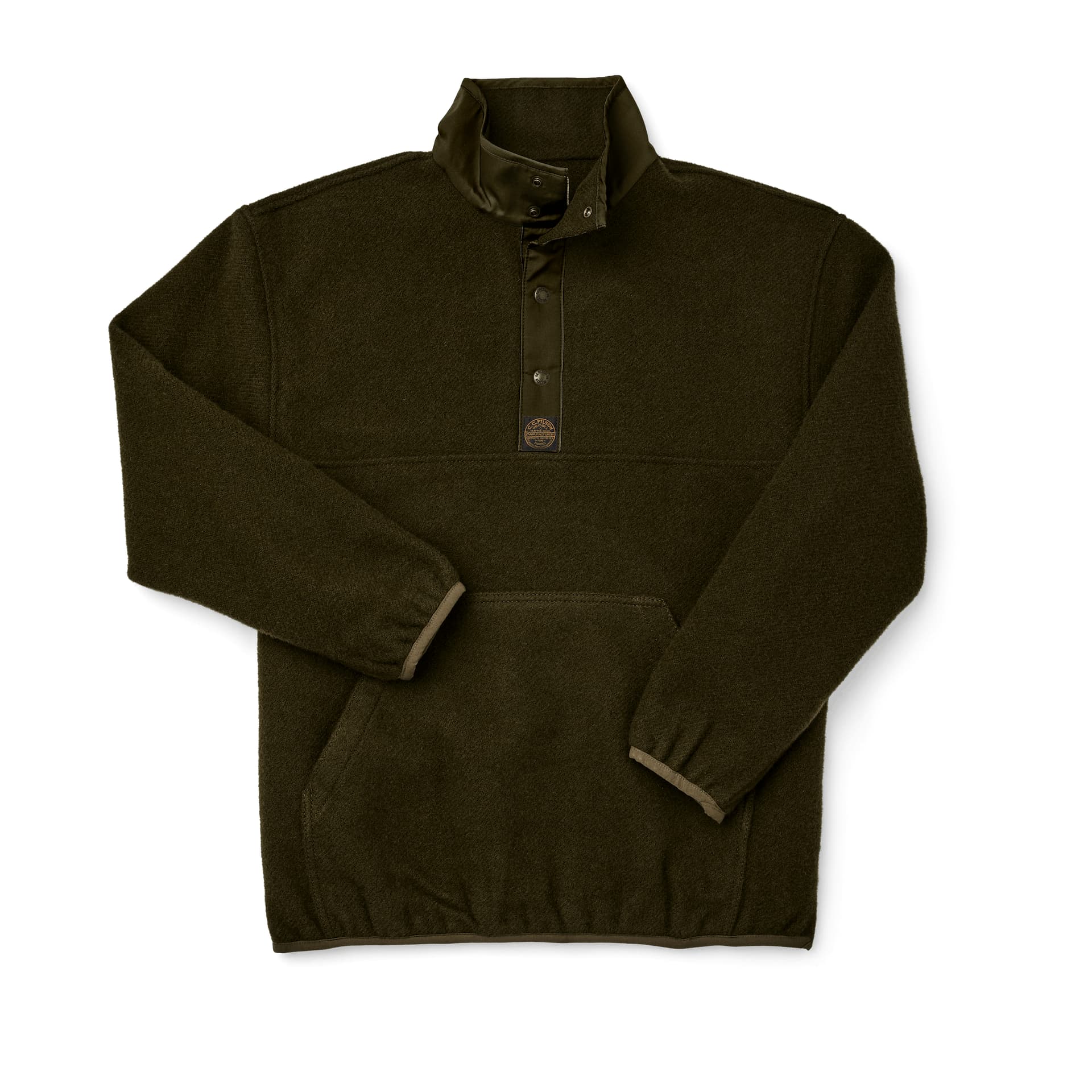 The Okanogan Wool Pullover blends a timeless sweater design with the weather protection of woven 100 percent wool. Its interior surface is brushed for lofty, heat-trapping comfort. The snaps on the front placket extend up the height of the short standing collar for additional wind protection and warmth. Elastic hem and cuffs seal out the wind and provide a custom fit. Kangaroo front pocket.