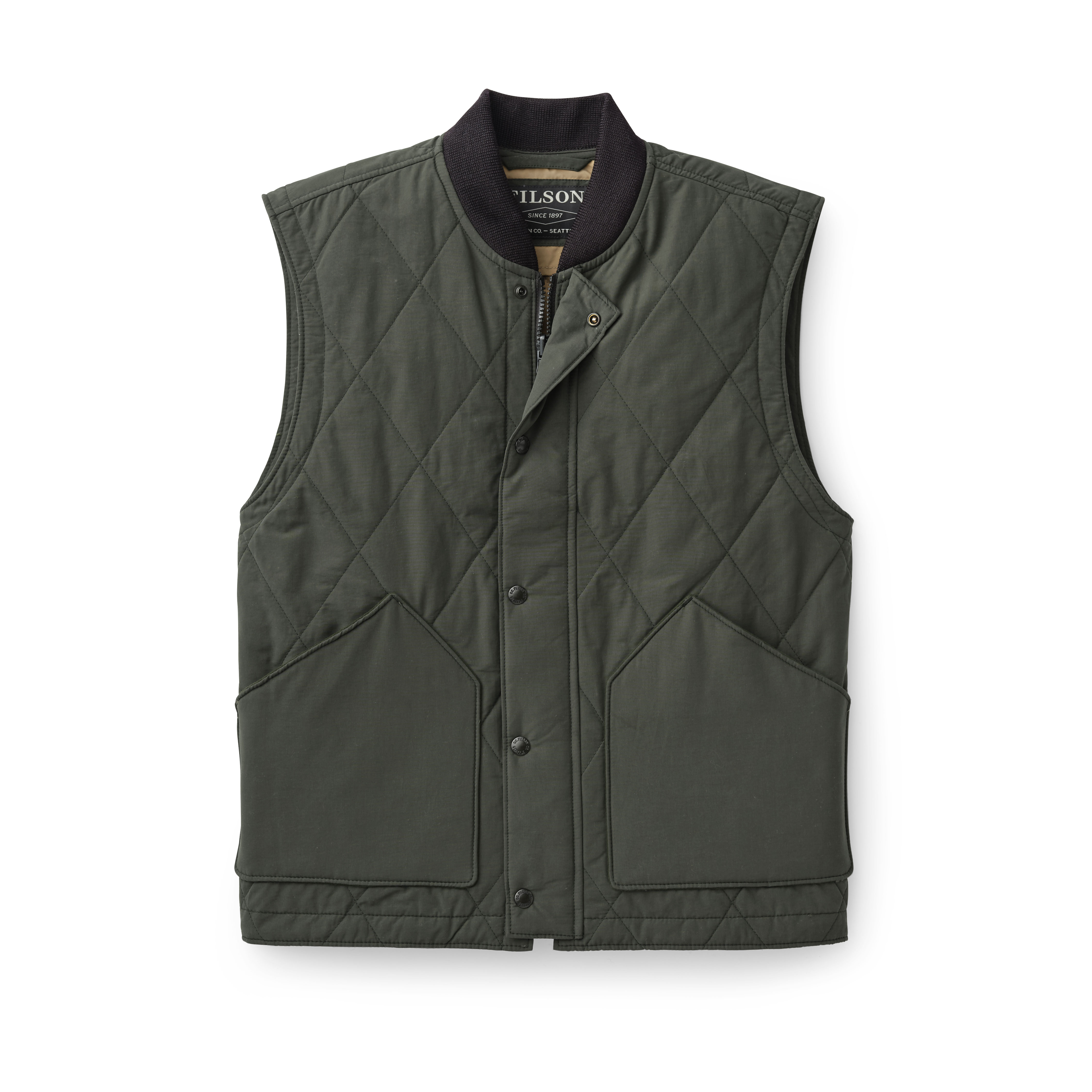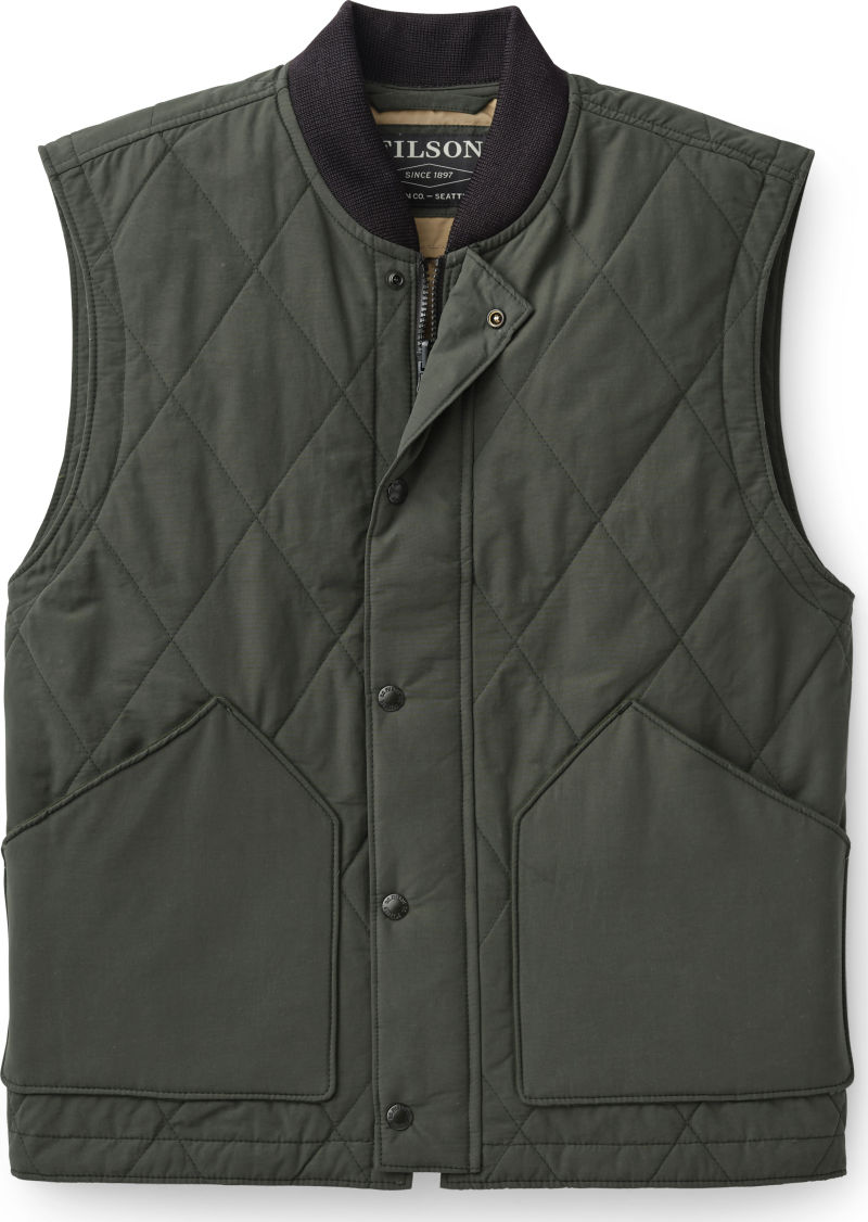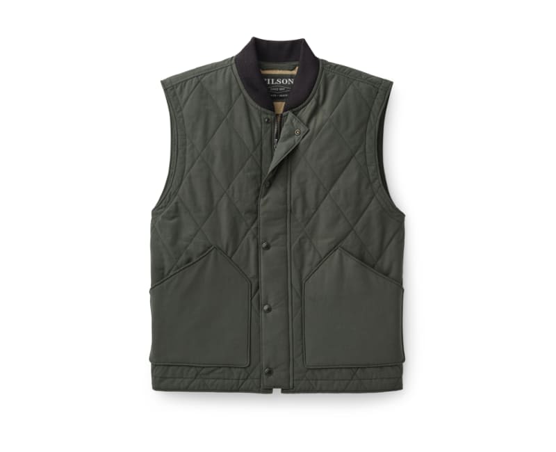 The Quilted Pack Vest provides light insulation on mild days, and can be zipped into select Filson coats when extra warmth is needed. The lightweight cotton and polyester shell has a durable water-repellent finish that sheds light rain and snow. 60-gram PrimaLoft Gold insulation has a high warmth-to-weight ratio, giving the vest a low profile thats ideal for layering. Outfitted with a drawcord-adjustable waist and zippers that connect with select Filson coats.