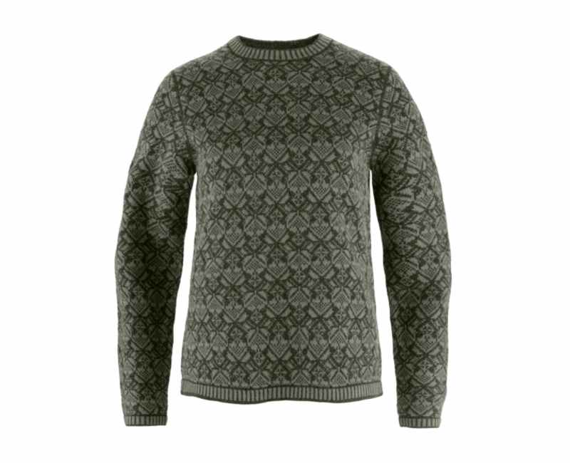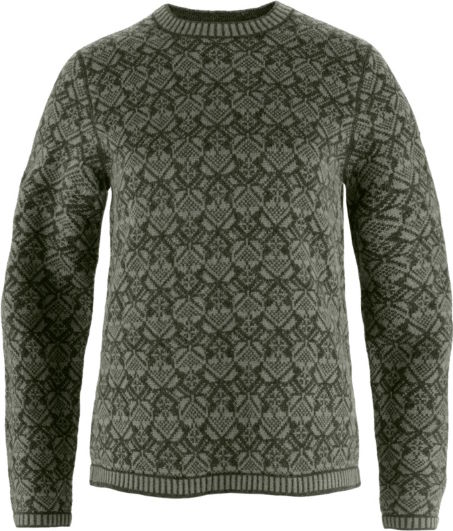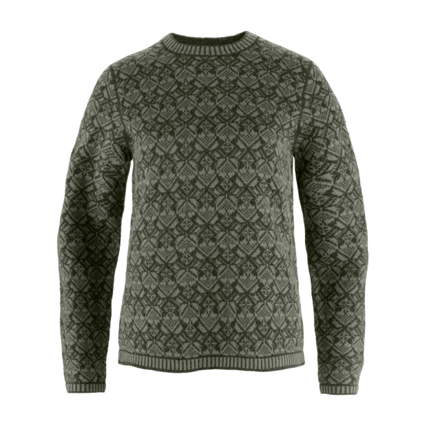 Building on the success of Snow Cardigan, Fjallraven is introducing the Snow Round Neck Sweater for women a beautiful jacquard-knitted garment in soft, warm 100% traceable ZQ lambs wool. The sweater showcases an attractive pattern inspired by Scandinavian folklore and features flatlock seams along with a classic mock neck. Ribbed cuffs, neck and hem. Leather fox logo on the sleeve.
