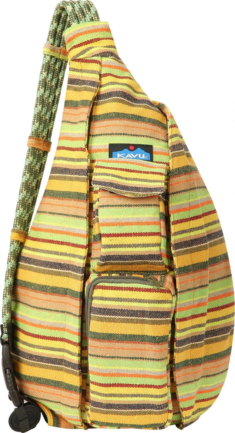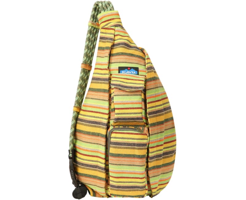 The Interwoven Rope Bag has all the features you love about KAVU's classic Rope Bag style - but this time in a beautiful polyester blend woven fabric that will elevate your rope bag game to a whole new level. Just like your favorite smoothie concoction this bag is the perfect fusion of style and function. Mix together the classic KAVU Rope Bag design with a dash of beach blanket inspired material, and then add a dollop of the sweetness of a sunny summer day and Bon Appetit' - you're Interwoven Rope Bag is served. Sling pack with adjustable rope shoulder strap, two vertical zip compartments, two key or cell phone pockets, padded back with KAVU embroidery.