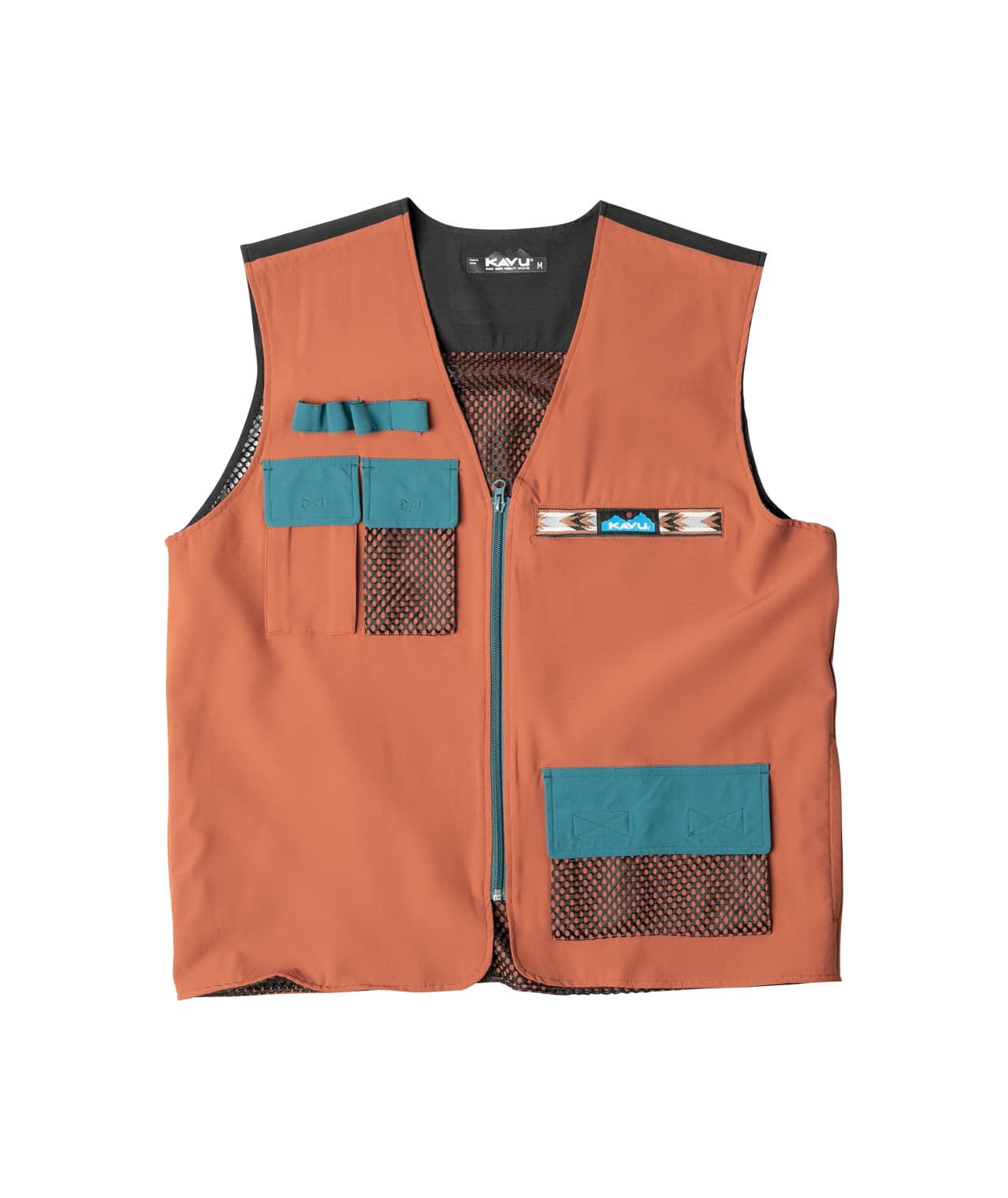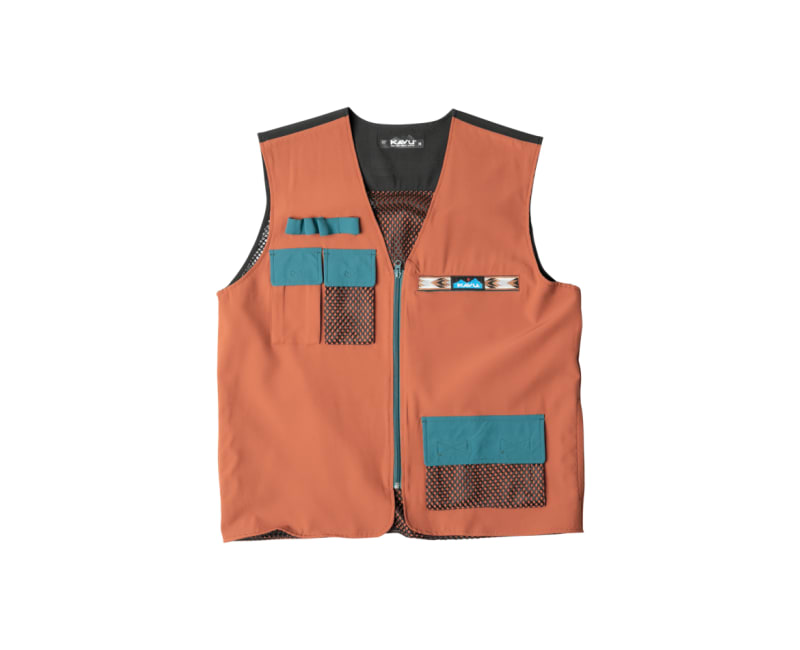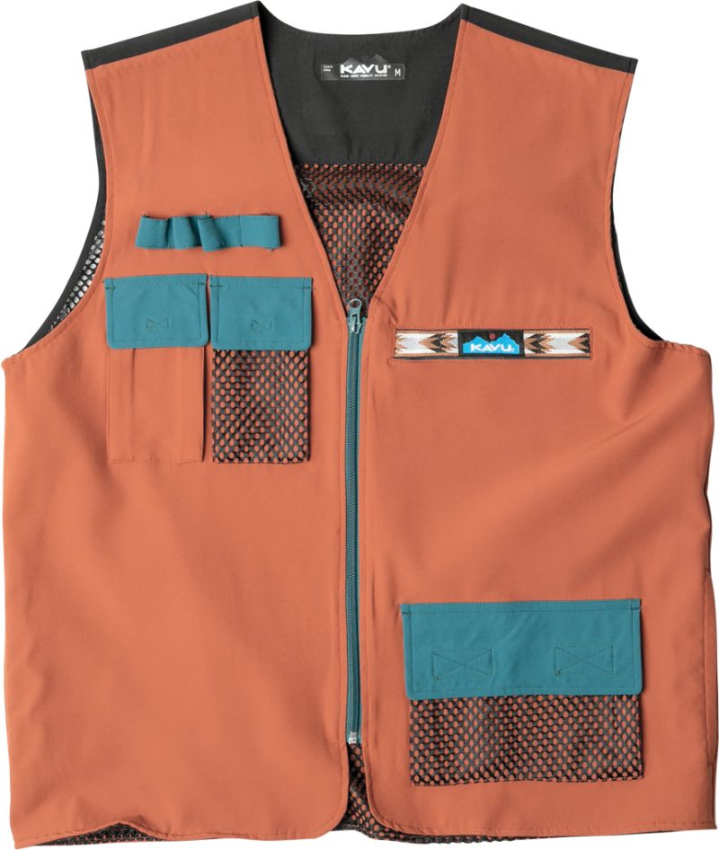 Did someone call for an adventure vest?? This quick dry poly-cotton stretch vest boasts eight pockets - and if youre on a KAVU adventure, youll use them all. The All Nighter boasts one secure zipper chest pocket with custom KAVU webbing, double cargo chest pockets bellowed at the side, a mesh outer pocket with Velcro closure, a lower cargo pocket with bellows and Velcro flap, an exterior mesh pocket with Velcro flap for tons of organization, plus on-seam hand pockets. Organization is great but, this much fire needs to breathe - hence the fully mesh-lined back serves as a ventilation window to keep you cool. Design constructed this vest for fishing, camping, hiking, or pulling an all nighter. Like all things KAVU - engineered for good times.Casual fit, full zip lightweight mesh lined vest, one chest zip pocket with patterned webbing and two twin pleated cargo pockets with Velcro closure (one additional mesh pocket), utility loop bar tacked above chest pockets, lower pleated cargo pocket (two additional mesh pockets) with Velcro closure and on seam hand pockets, back mesh gusseted panels.