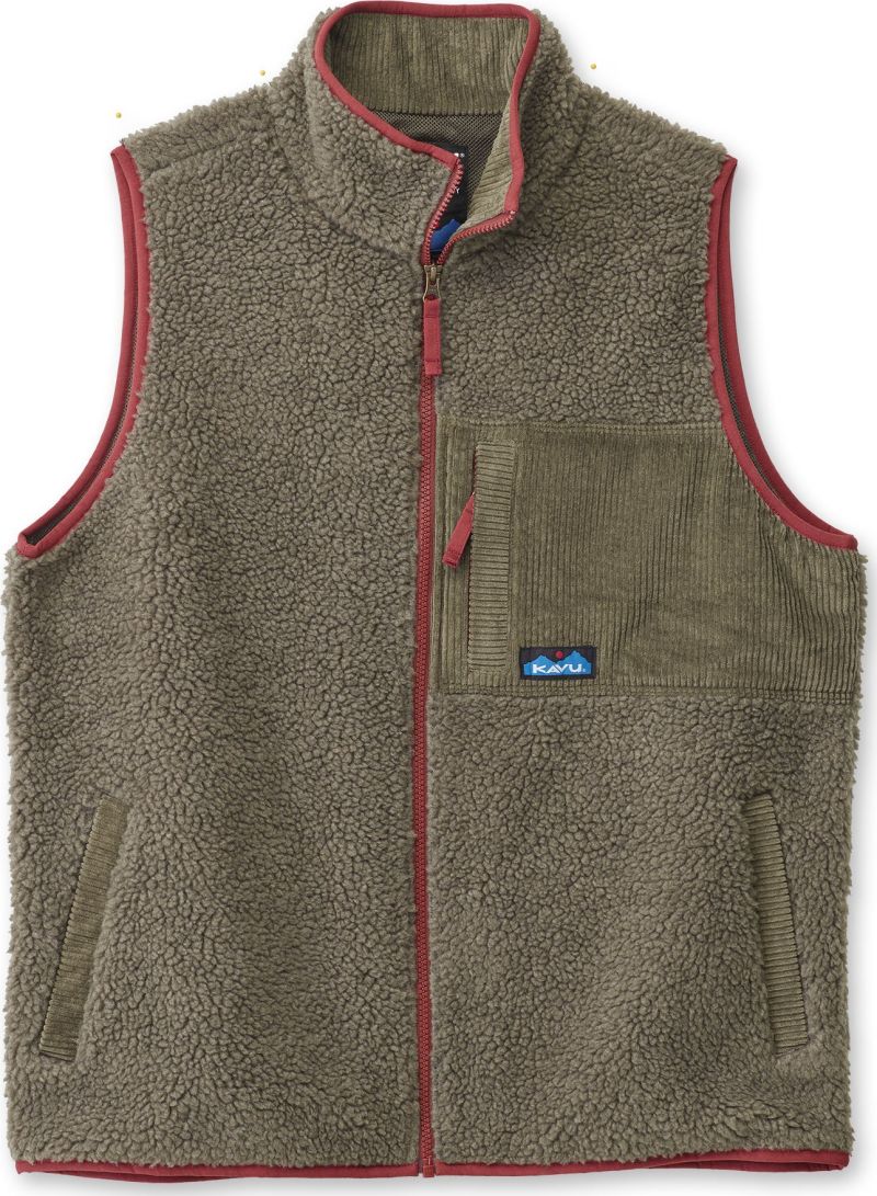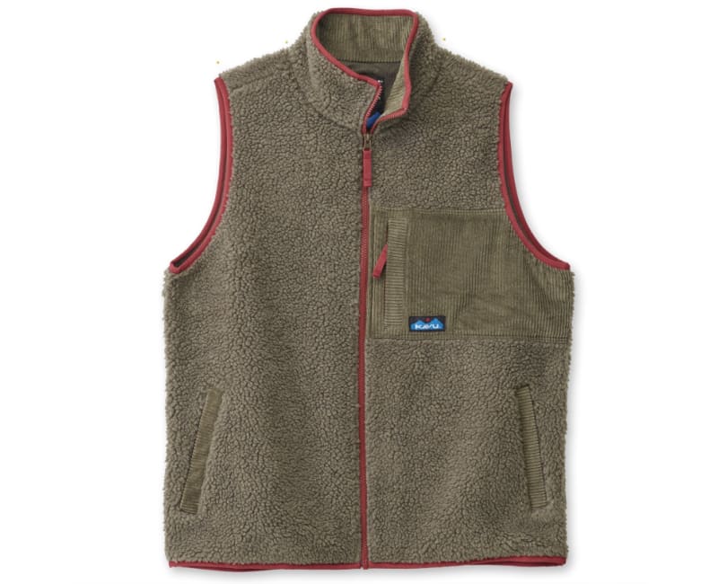 Casual fit, full zip mock neck sherpa fleece vest, corduroy pieced chest welt zip pocket and hand welt pockets, and inside neck facing, self fabric zip pulls, pop colored elastic binding at sleeve, top collar and bottom hem.