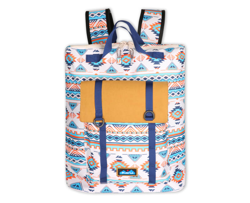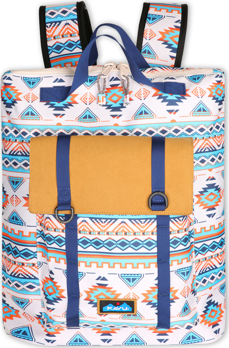 Semi padded rucksack with adjustable padded contoured shoulder straps, fixed hand straps, large internal pouch, multiple interior zip and organizational compartments, one exterior patch pocket with synthetic leather flap and velcro closure, padded back and bottom panel.