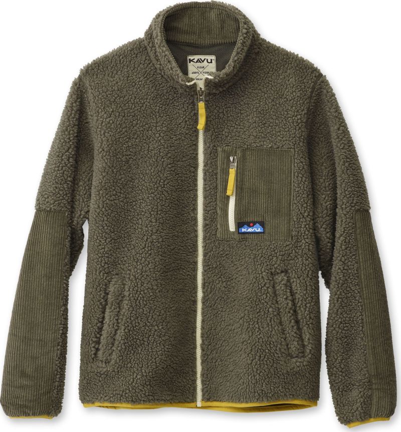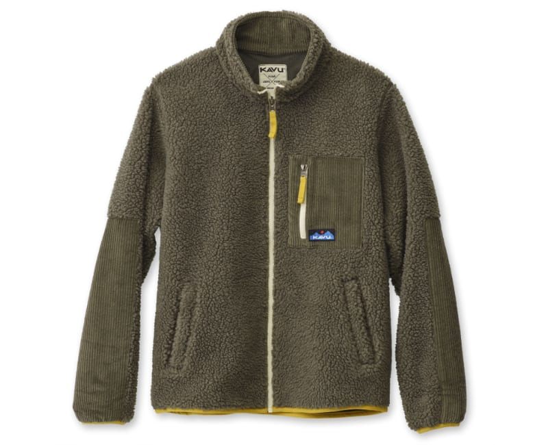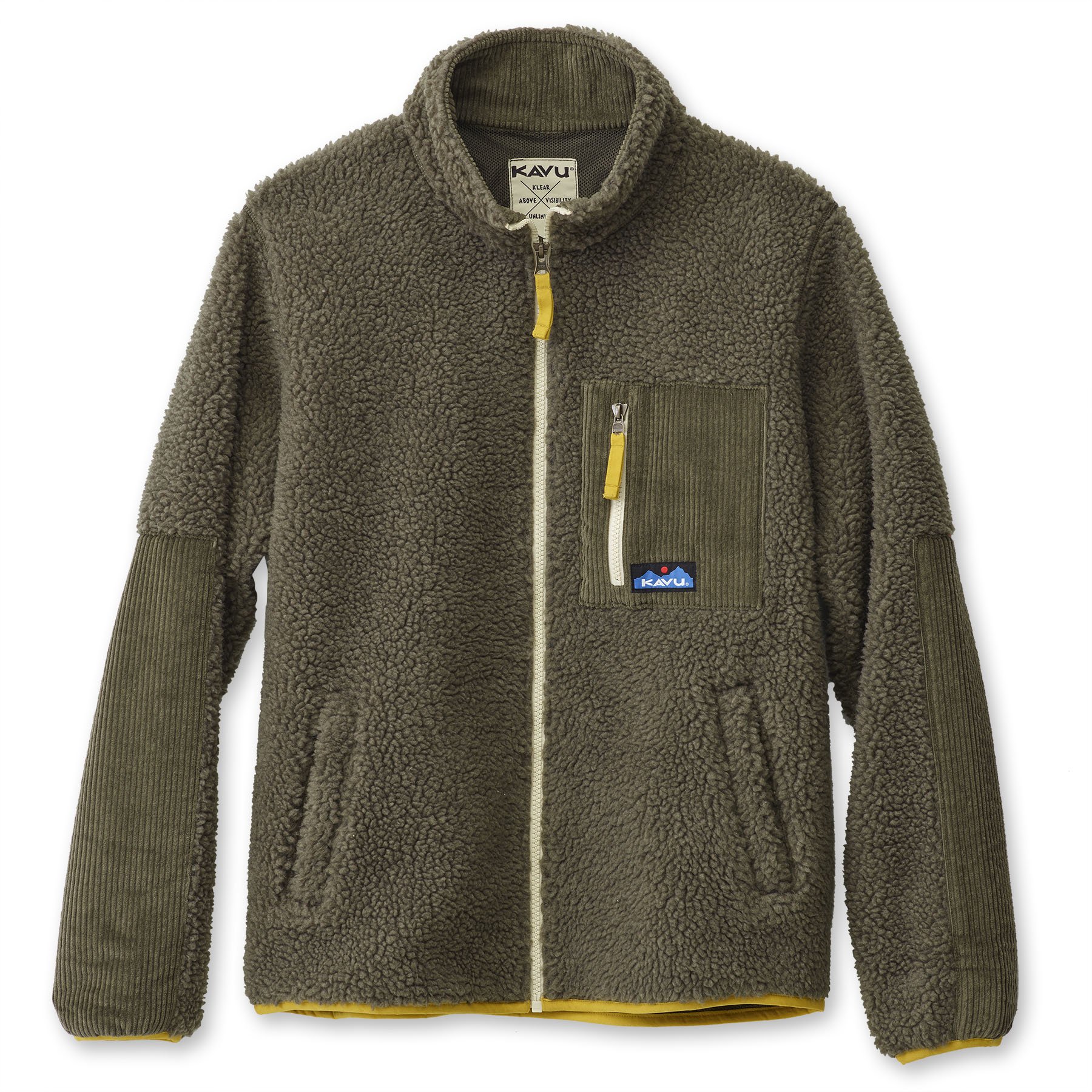 Casual fit, full zip mock neck sherpa fleece jacket, corduroy pieced chest zip pocket, elbow patches, and inside facing, hand pockets, pop colored elastic binding on sleeve cuffs and bottom opening and zip pulls.