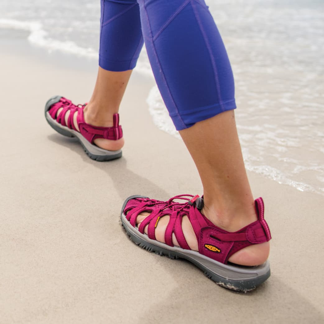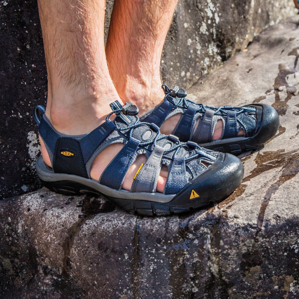 The Newport Sandals and the Newport H2s have a squishy, soft neoprene upper ( straps). Those straps helps dispense the shoe's pressure and are very quick drying. The open sides allow water to flow in and out, while the stable rubber sole allows for longer day hiking. Other quick drying sandals are the Venice, Whisper, Clearwater CNX, Uneek, and Bali Strap Sandals.