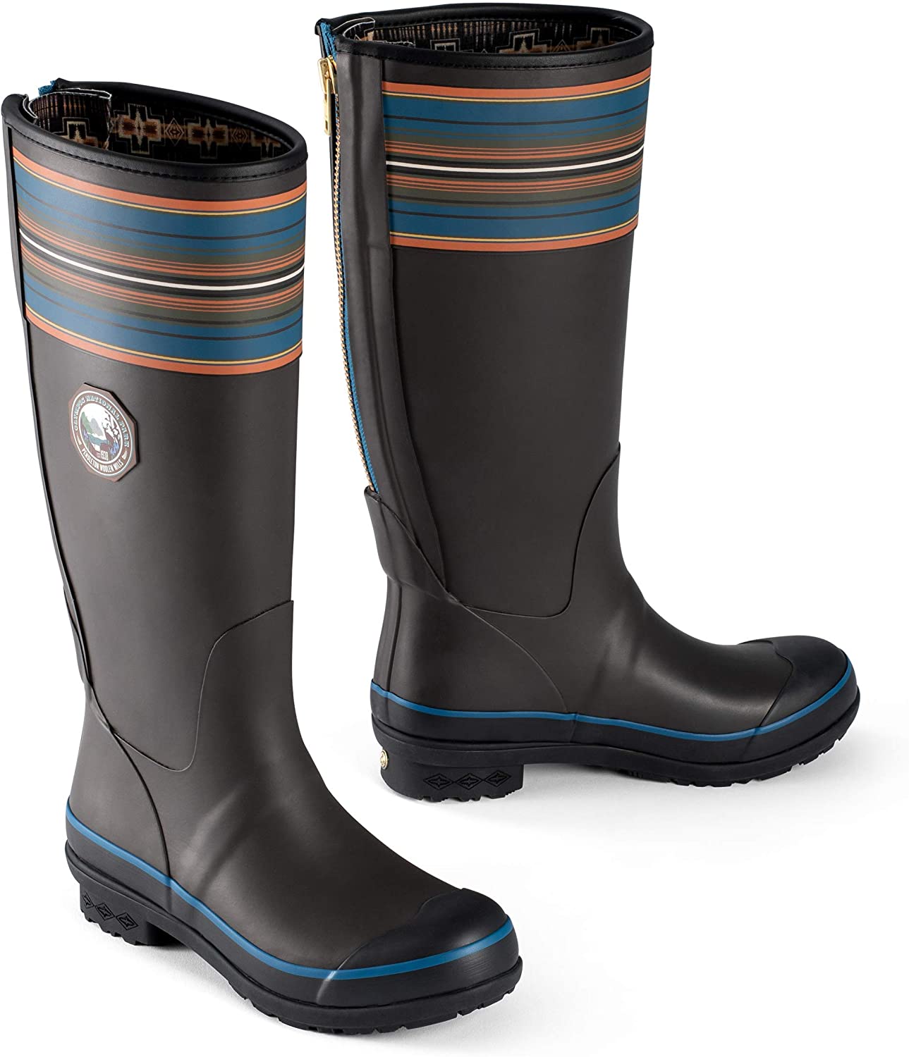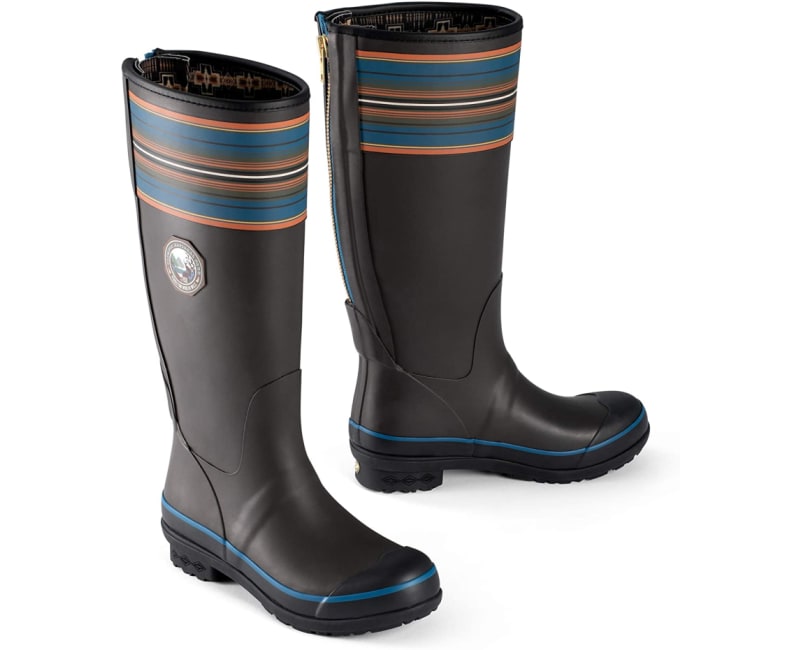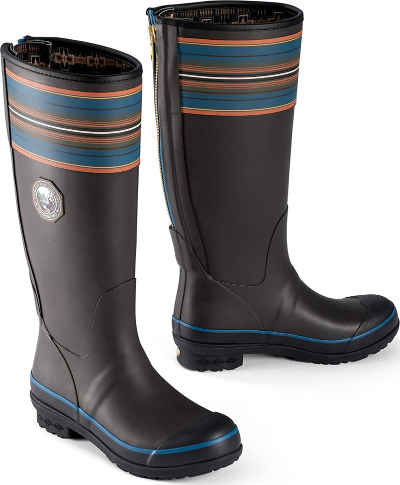 Splash-happy, womens rain boots emblazoned with our beloved National Park stripes and vintage logo. Constructed of premium rubber with slip-resistant soles and exclusive Mountain Majesty tread. Cushioned insoles and internal shank system provide all-day comfort and support; back zipper allows for easy on-and-off. Moisture-wicking linings feature our iconic Harding pattern.